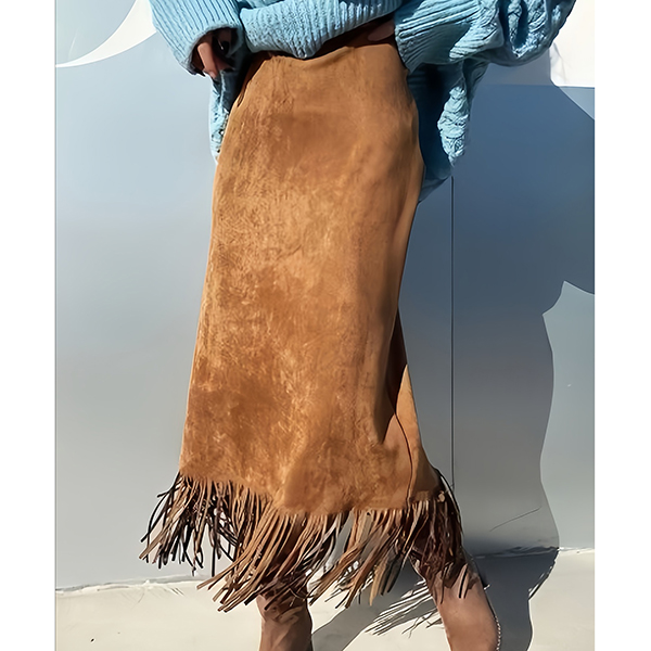 This elegant skirt combines classic silhouette with luxurious textures for sophisticated femininity. The suede material provides rich tactile appeal with soft luxurious finish that elevates everyday styling, while the tassel hemline adds playful movement detail that softens the structured fit. Perfect for daily wear.