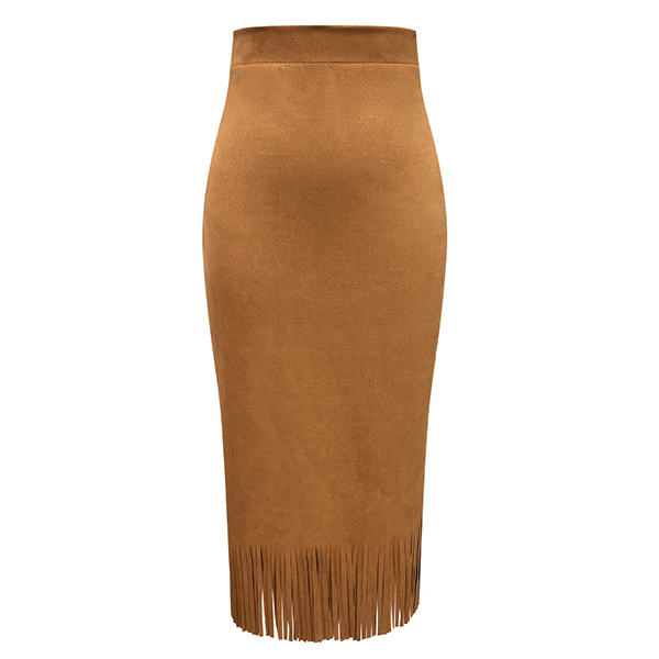 Fashion Solid Color High-rise Tassel Hemline Pencil Suede Skirt