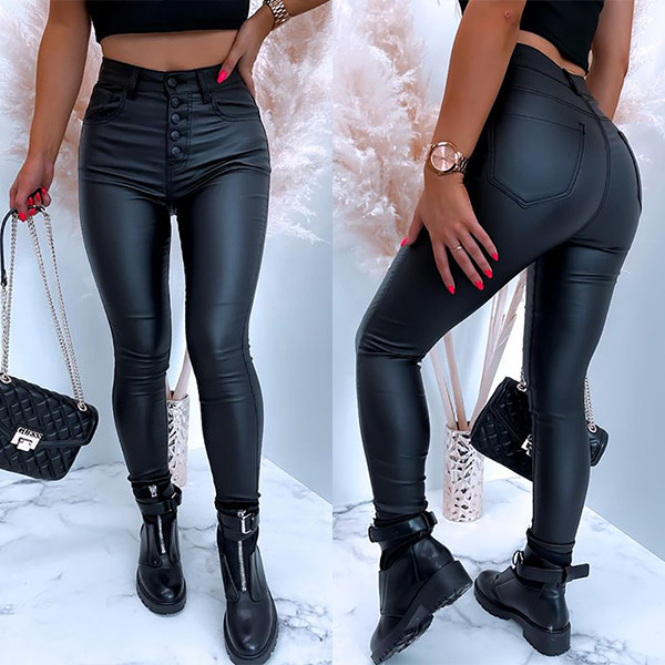 Fashion Solid Color High Waist Front-button Slim Fit PU Leather Pants