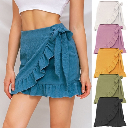 Fashion Solid Color High Waist Irregular Lace-up Ruffle Skirt
