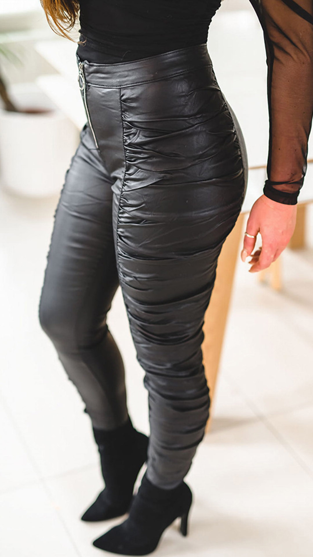 Fashion Solid Color High Waist Slim Fit Wrinkled PU Leather Pants