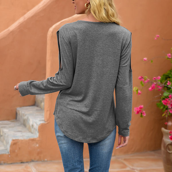If you are looking for a t-shirt that is combines of cozy and stylish vibes,then you can make your eyes focsued on this piece. Solid color tone design makes it look simple yet generous,while the v-neck and hollow out design at the sleeve part will lend you a dash of flirty and feminine vibes. Attracted? Then buy it!