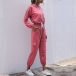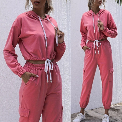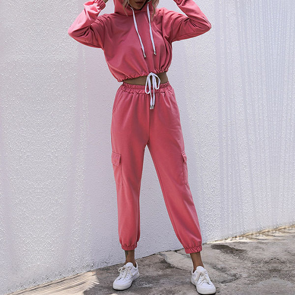 Showcase your youthful,girlish side through this two-piece set. Comes with a sweet and stylish pink tone,including a long sleeve hooded crop top and a high waist pants,this two-piece set not only can showcase your figure,but also can maintain a stylish,relaxed daily style. Perfect fit for you when you have no time to do your daily matching.