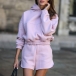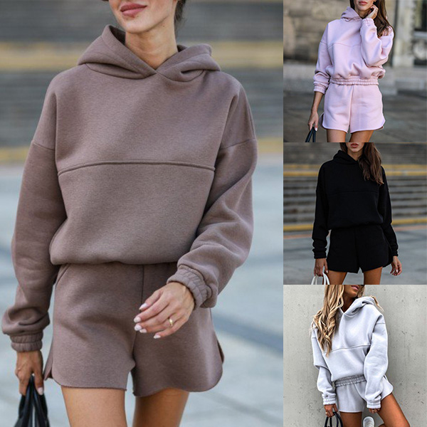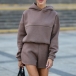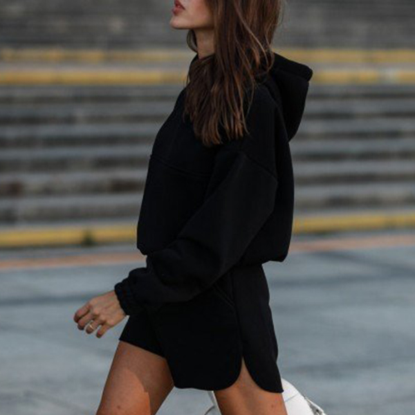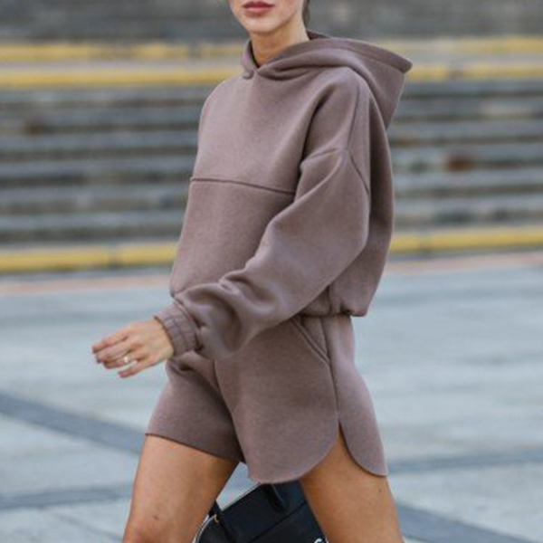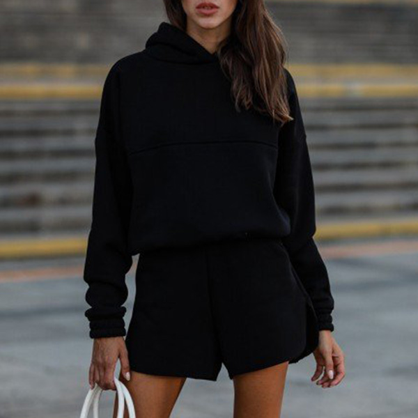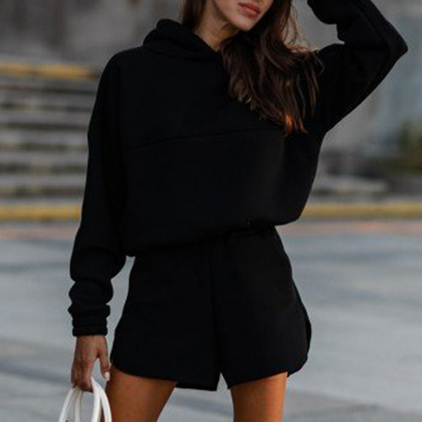 Fashion Solid Color Hooded Long Sleeve Sweatshirt + Shorts Two-piece Set