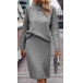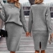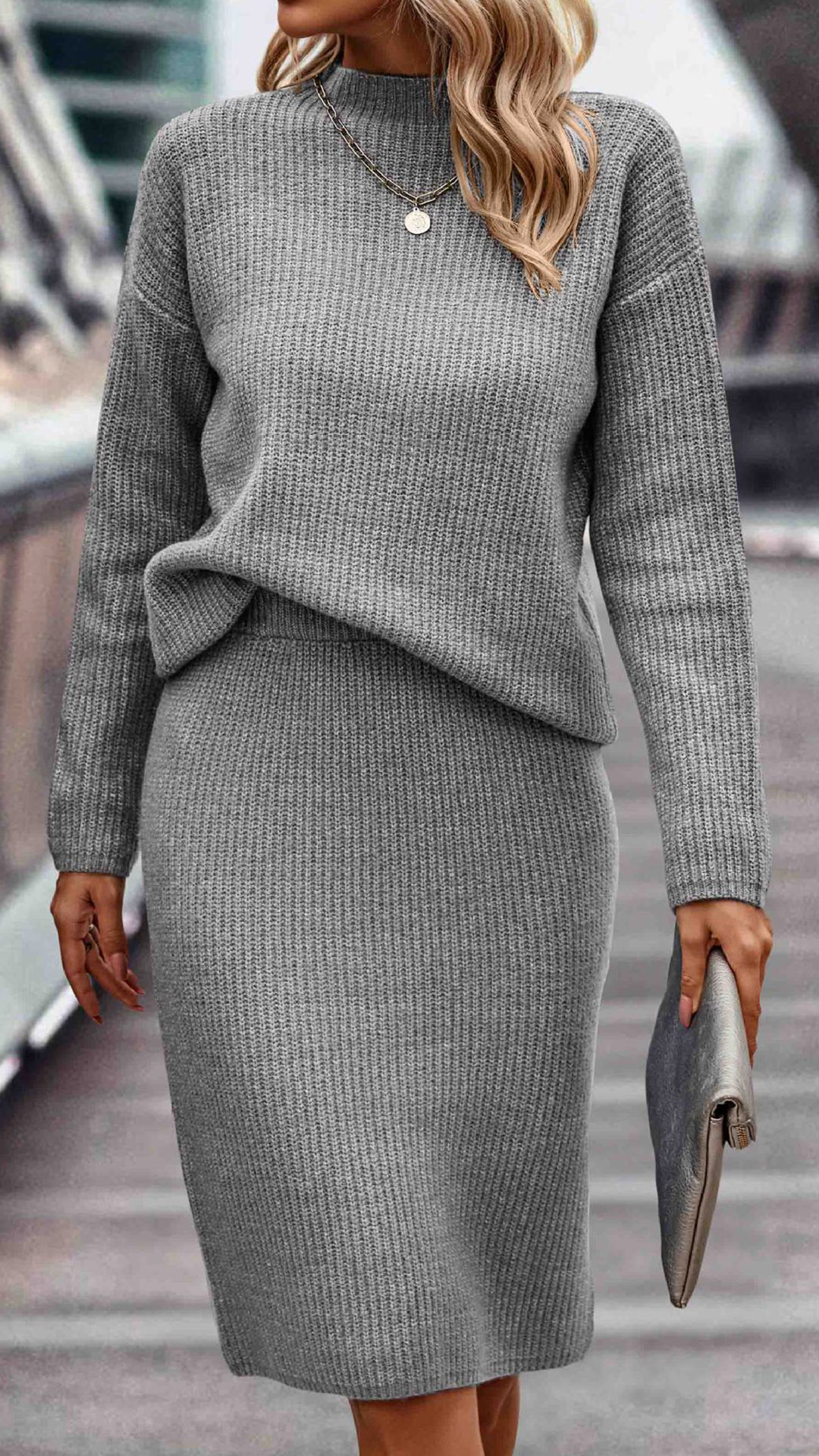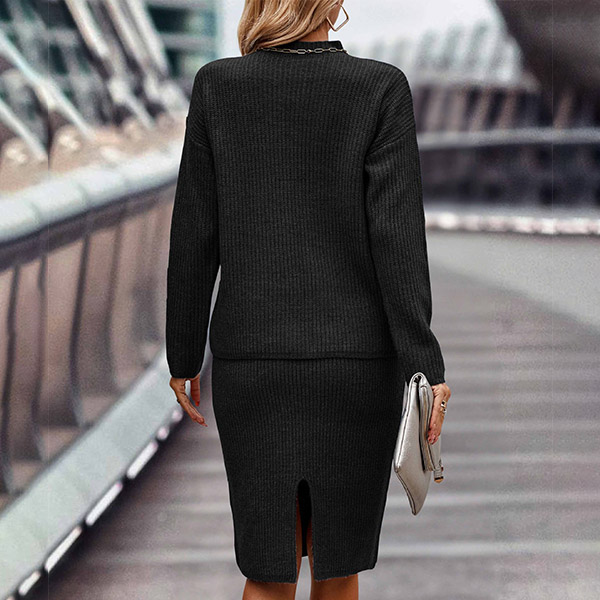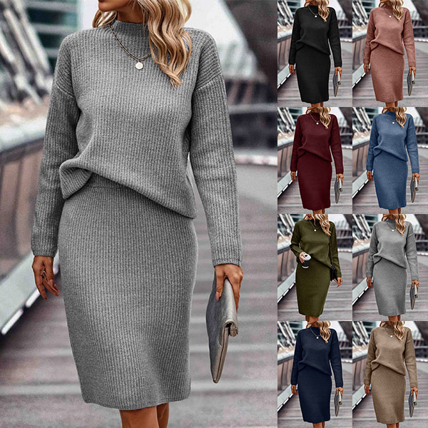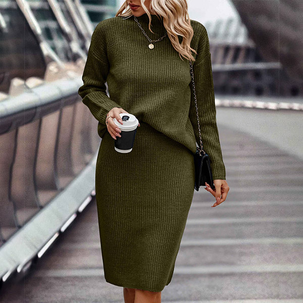 This stylish set combines comfort with contemporary fashion. The mock neck sweater offers a sleek and sophisticated look, while the knitted fabric provides warmth and a soft touch against your skin. The coordinating slit skirt adds a touch of elegance and allure, creating a fashionable silhouette. Whether you choose to wear them together as a set or mix and match them with other items, this two-piece set is perfect for both casual and dressier occasions, providing a versatile and chic outfit option.