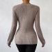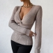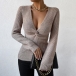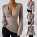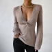 Fashion Solid Color Knotted V-neck Long Sleeve Ribbed Shirt