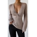 The knotted V-neck adds a trendy and feminine touch, creating a flattering and eye-catching look. The ribbed texture adds dimension and interest to the shirt, giving it a modern and fashionable edge. Perfect for daily wear.