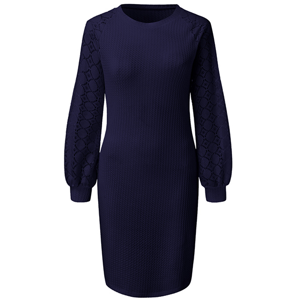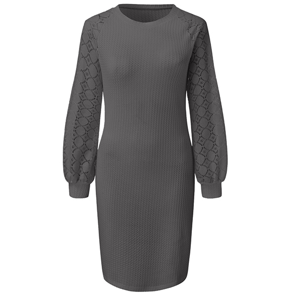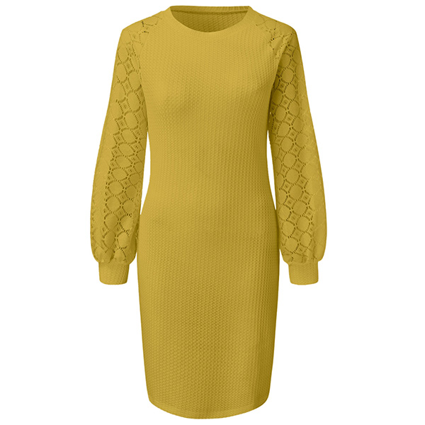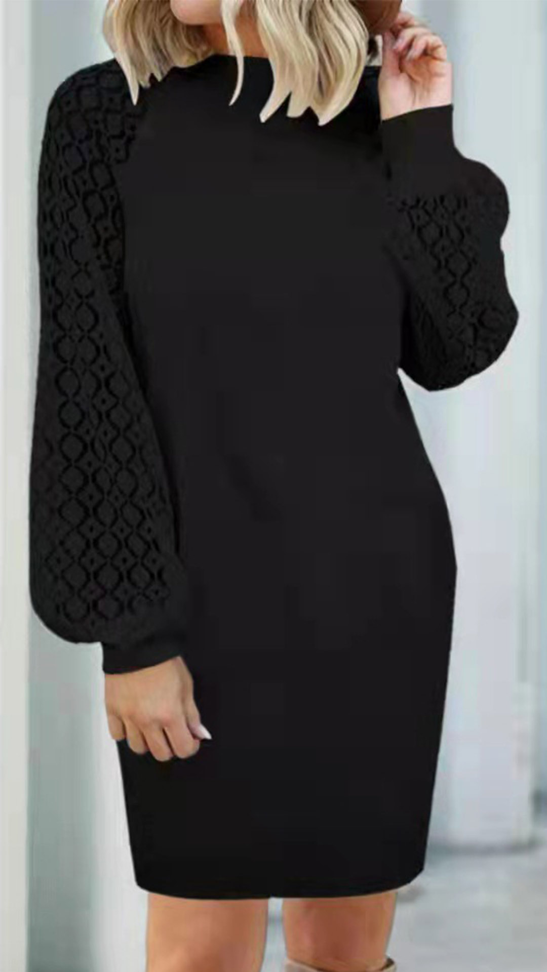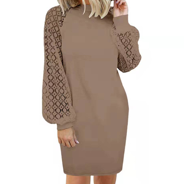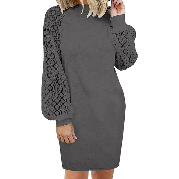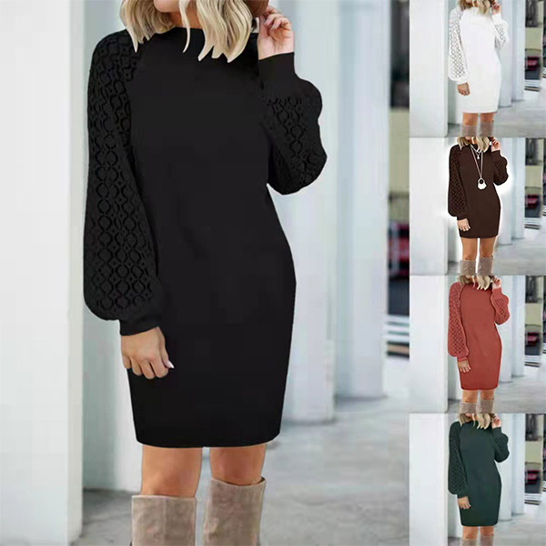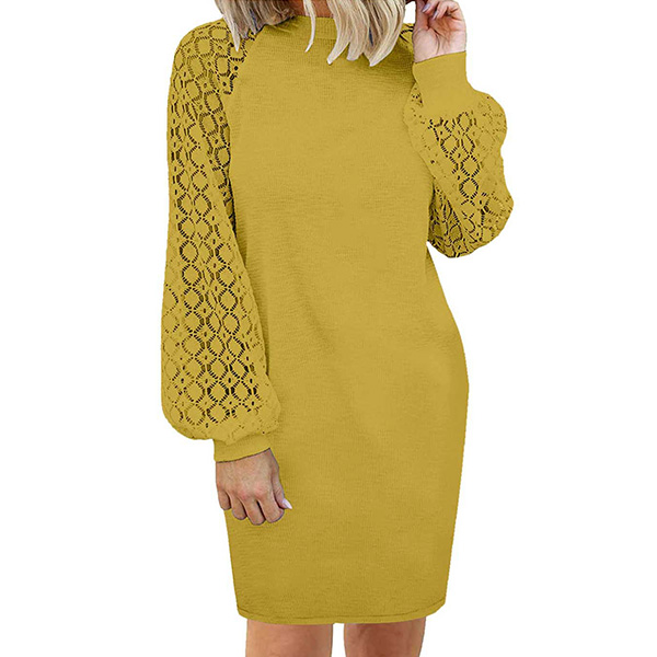 Fashion Solid Color Lace Spliced Lantern Sleeve Mock Neck Knit Shift Dress