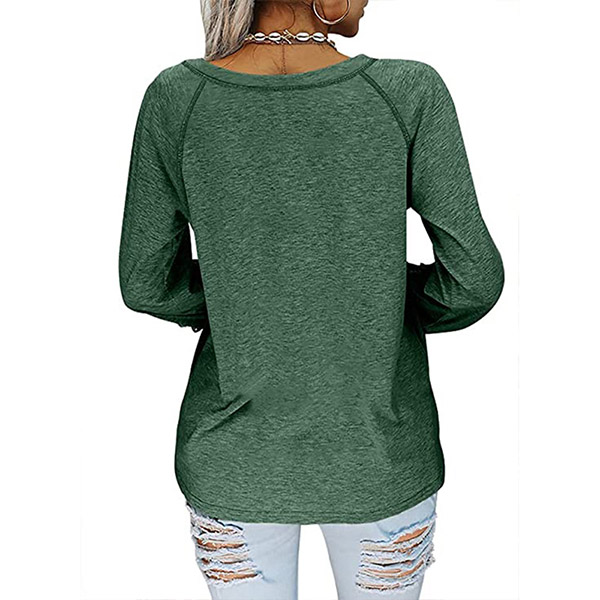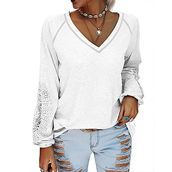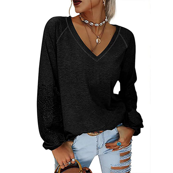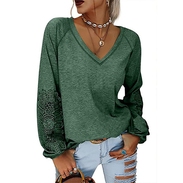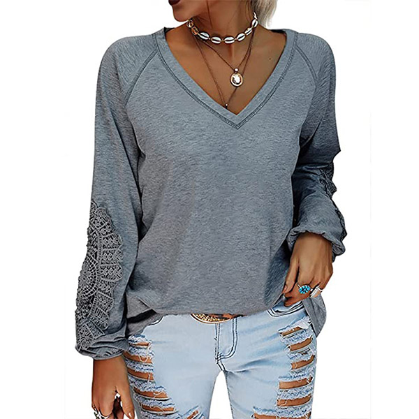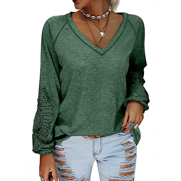 Fashion Solid Color Lace Spliced Lantern Sleeve V-neck Loose T-shirt
