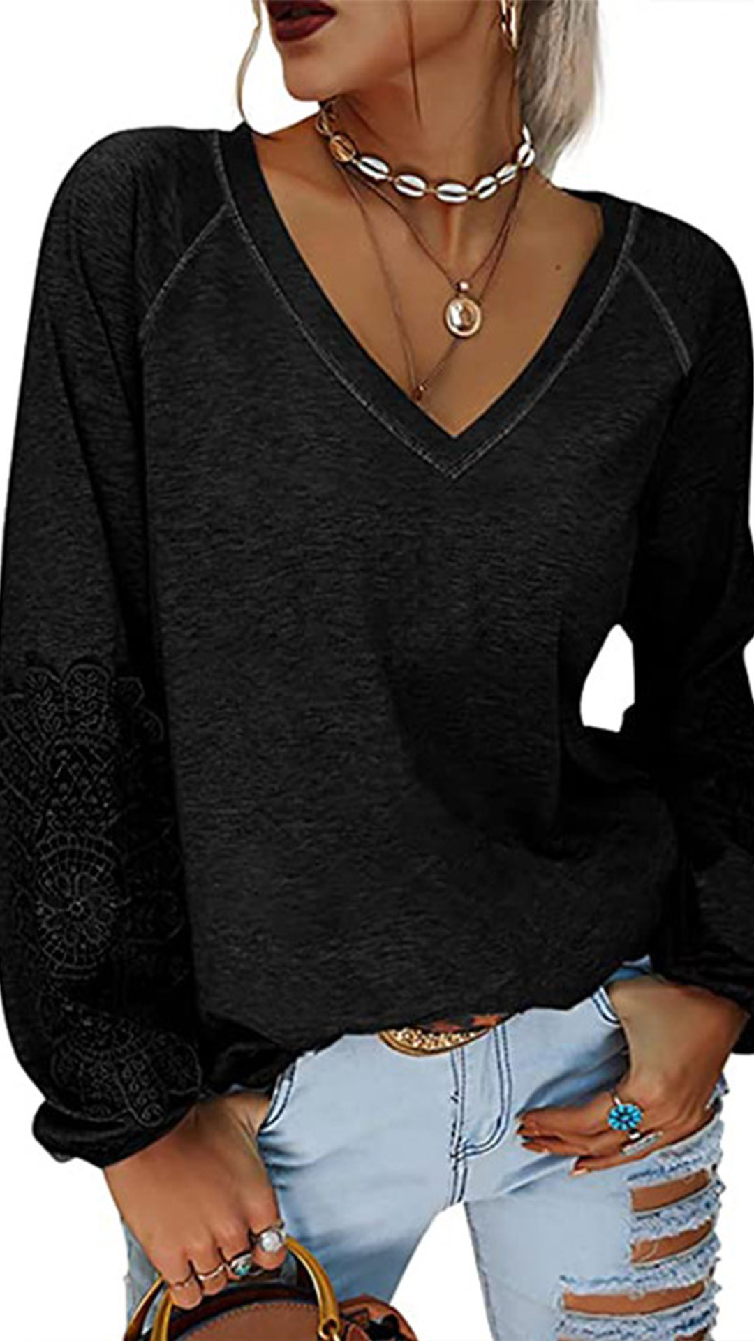 This t-shirt comes with a solid color,its soft,breathable fabric and loose silhouette design will give you a long-lasting comfort,while the lantern sleeve and lace spliced details at the sleeve part will enhance its charm. Your casual days call for such a cozy yet stylish t-shirt!