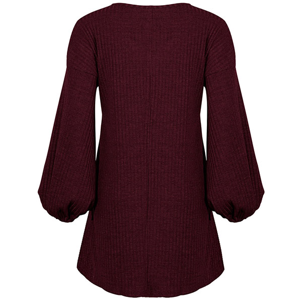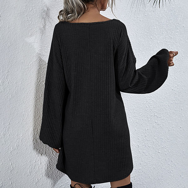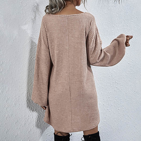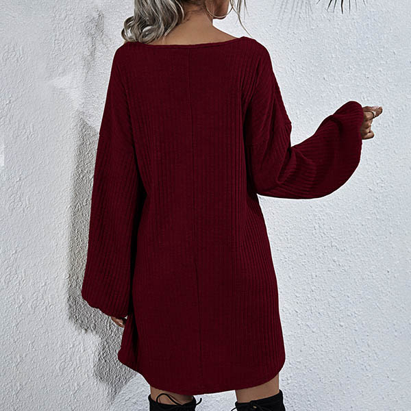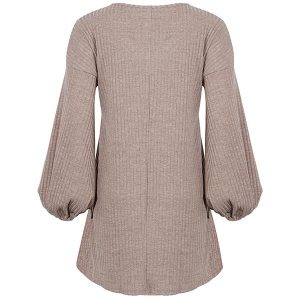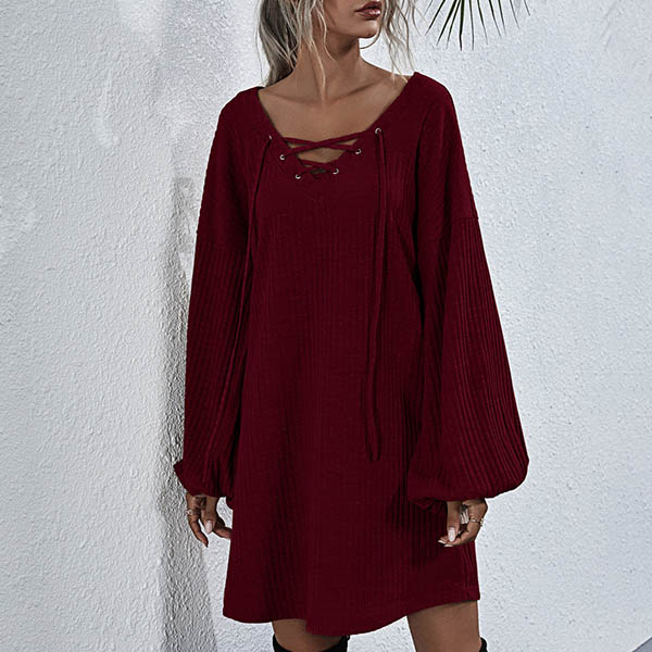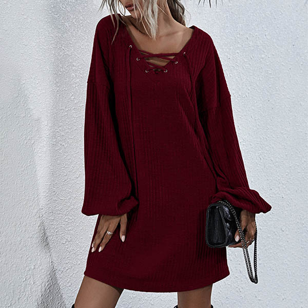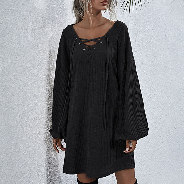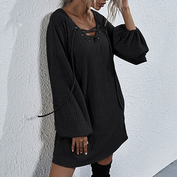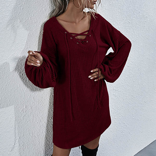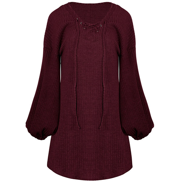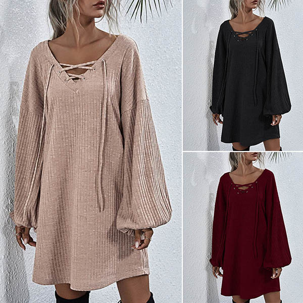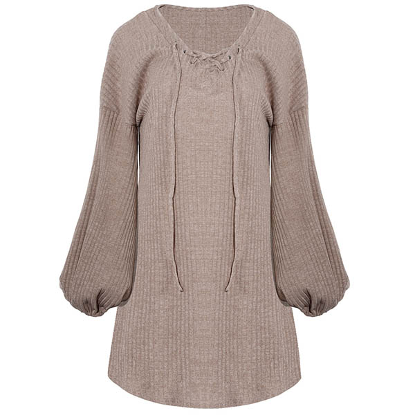Effortless cozy yet stylish,this knit dress is just what you need on your early autumn days. What makes this piece look so stylish and attractive? It owes to the lantern sleeve and lace-up v-neck design. So why not match with your over-the-knee boots to have a wonderful day?