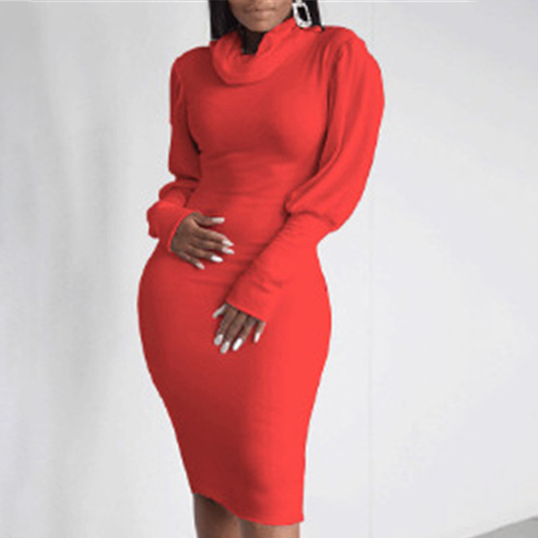 Fashion Solid Color Lantern Sleeve Cowl Neck Slim Fit Dress