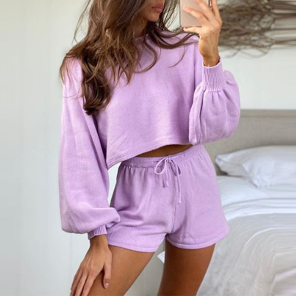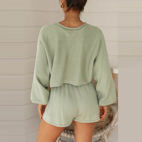 Fashion Solid Color Lantern Sleeve Crop Top + Shorts Knit Two-piece Set