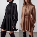 Fashion Solid Color Lantern Sleeve Stand Collar High Waist Chiffon Dress