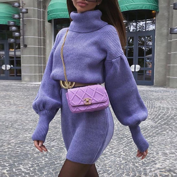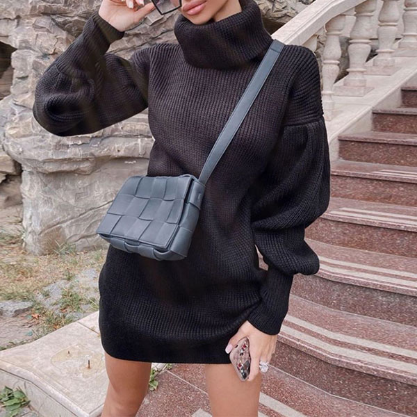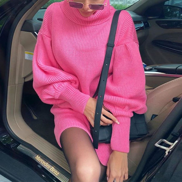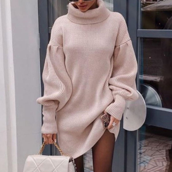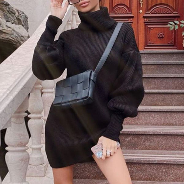 Give your wardrobe a seasonal update by adding this comforting knit dress. What makes this piece look so attractive? It owes to the lantern sleeve design. Solid color style,finished with turtleneck and a clean silhouette,this piece can keep you warm while it maintains your style.