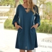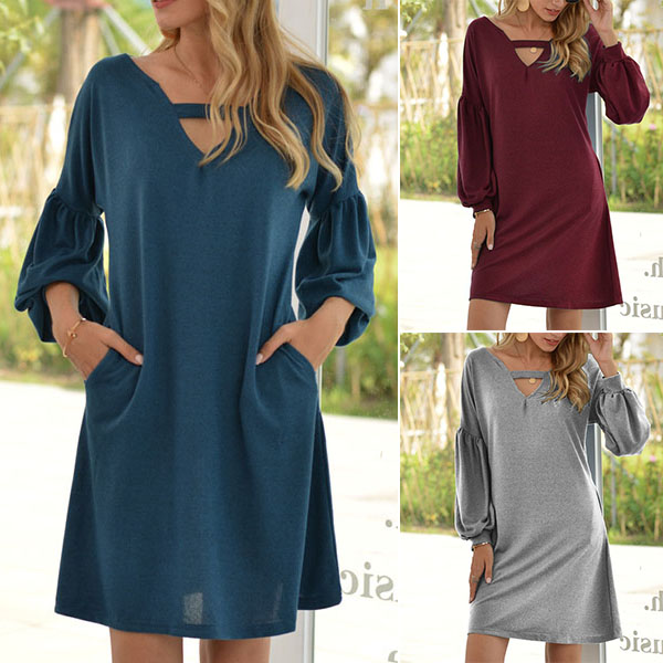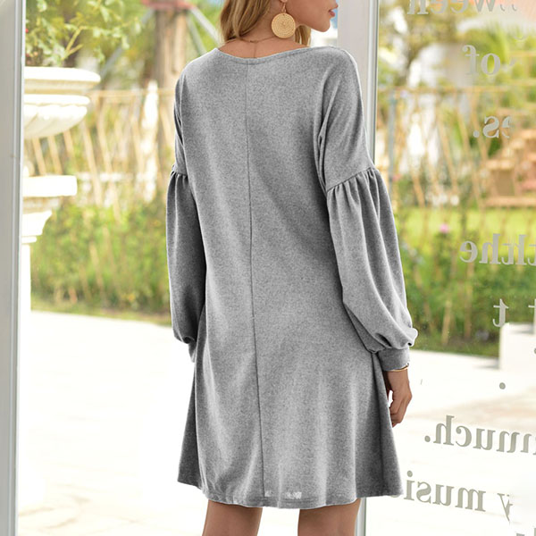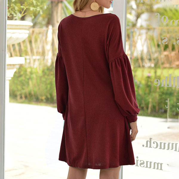Fashion Solid Color Lantern Sleeve V-neck Dress