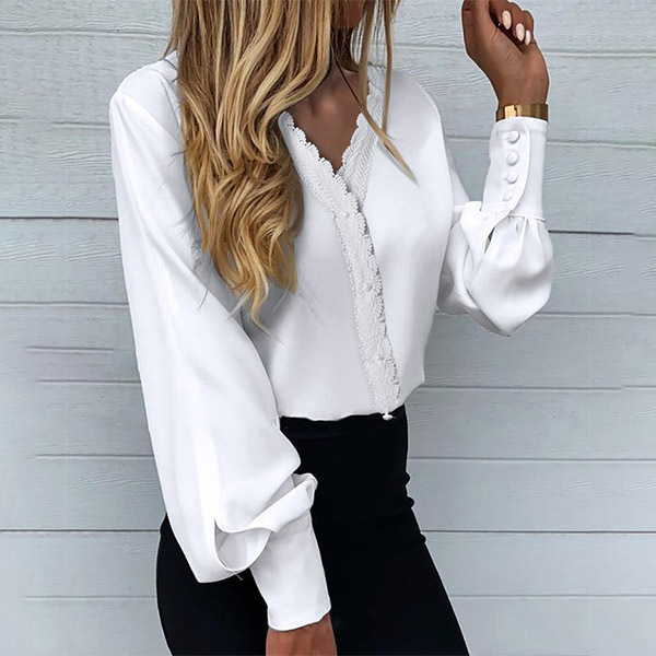 This blouse that combines of stylish and feminine vibes is worth to arouse your attention. Comes with a classic yet stylish white tone,the lantern sleeve,v-neck and lace spliced details will make this piece look more stylish and attractive. Another design highlight is that it can offer you different matching styles.