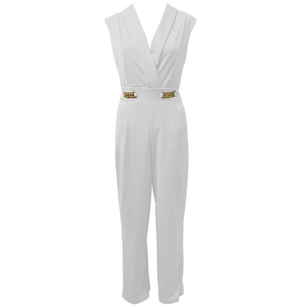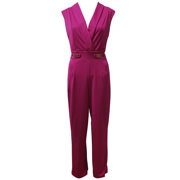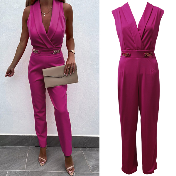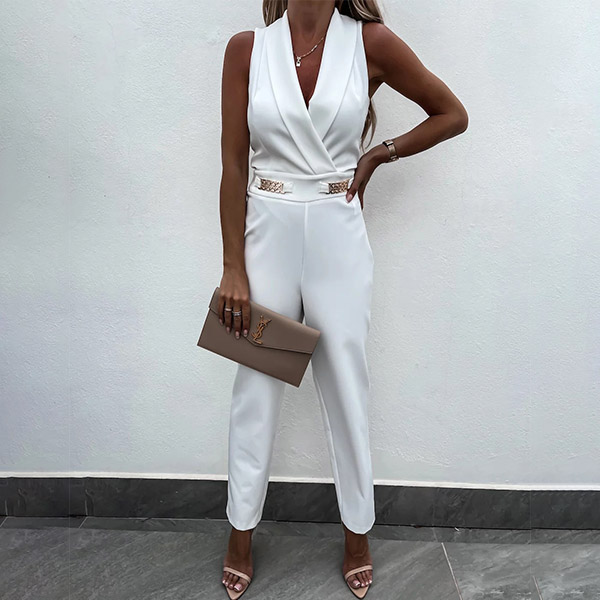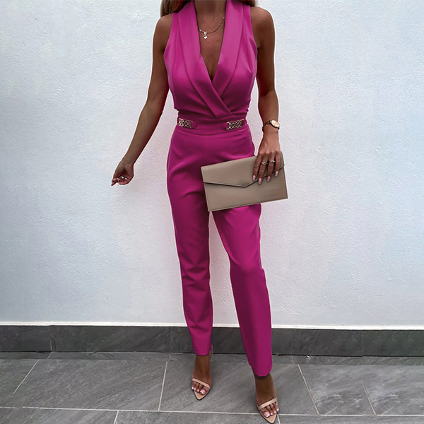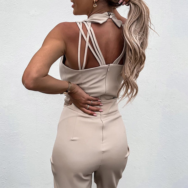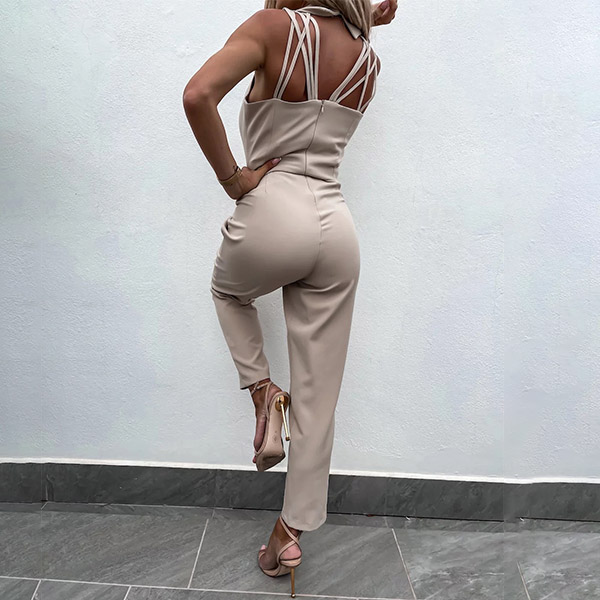 Jumpsuit features V-neck, lapels, and a cross-criss backless design. The solid color makes it versatile and easy to accessorize.