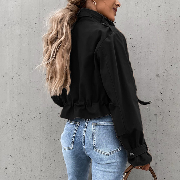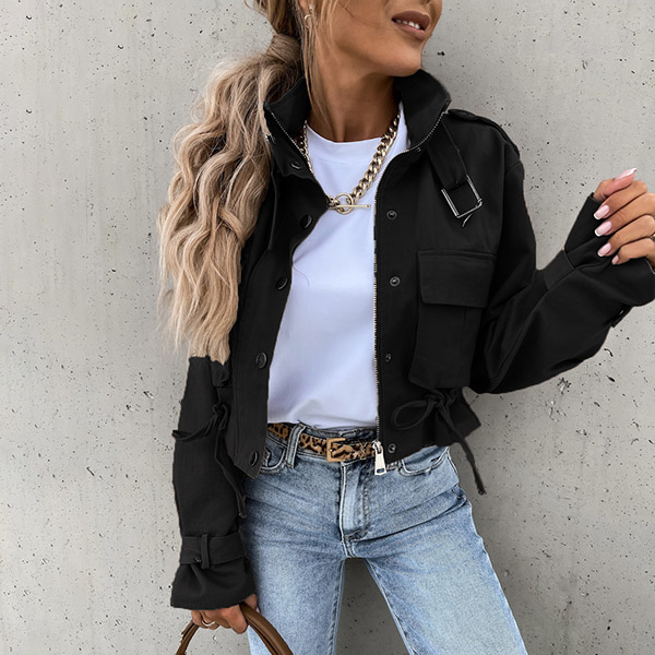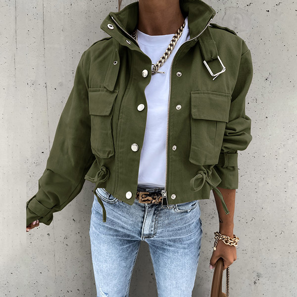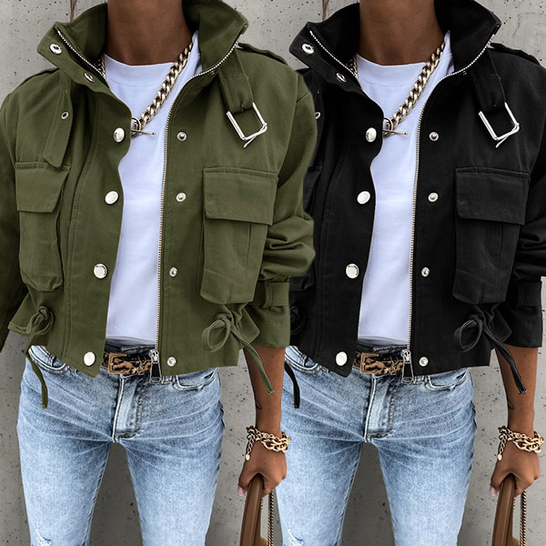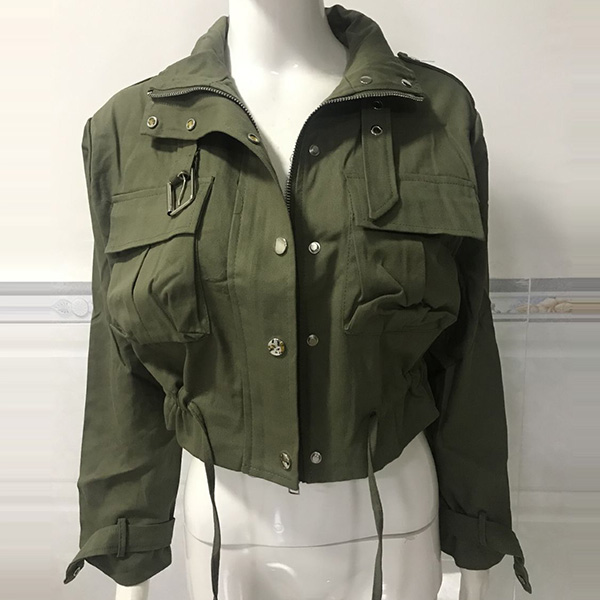 Wanna try a different style jacket? Then you can make your eyes focused on this piece. The big pockets,stand collar and front-button details make this piece look not so simple and dull. And the drawstring design at the pocket part will further enhance its entire charm. When the days get a little cold,this piece would be your perfect choice.
