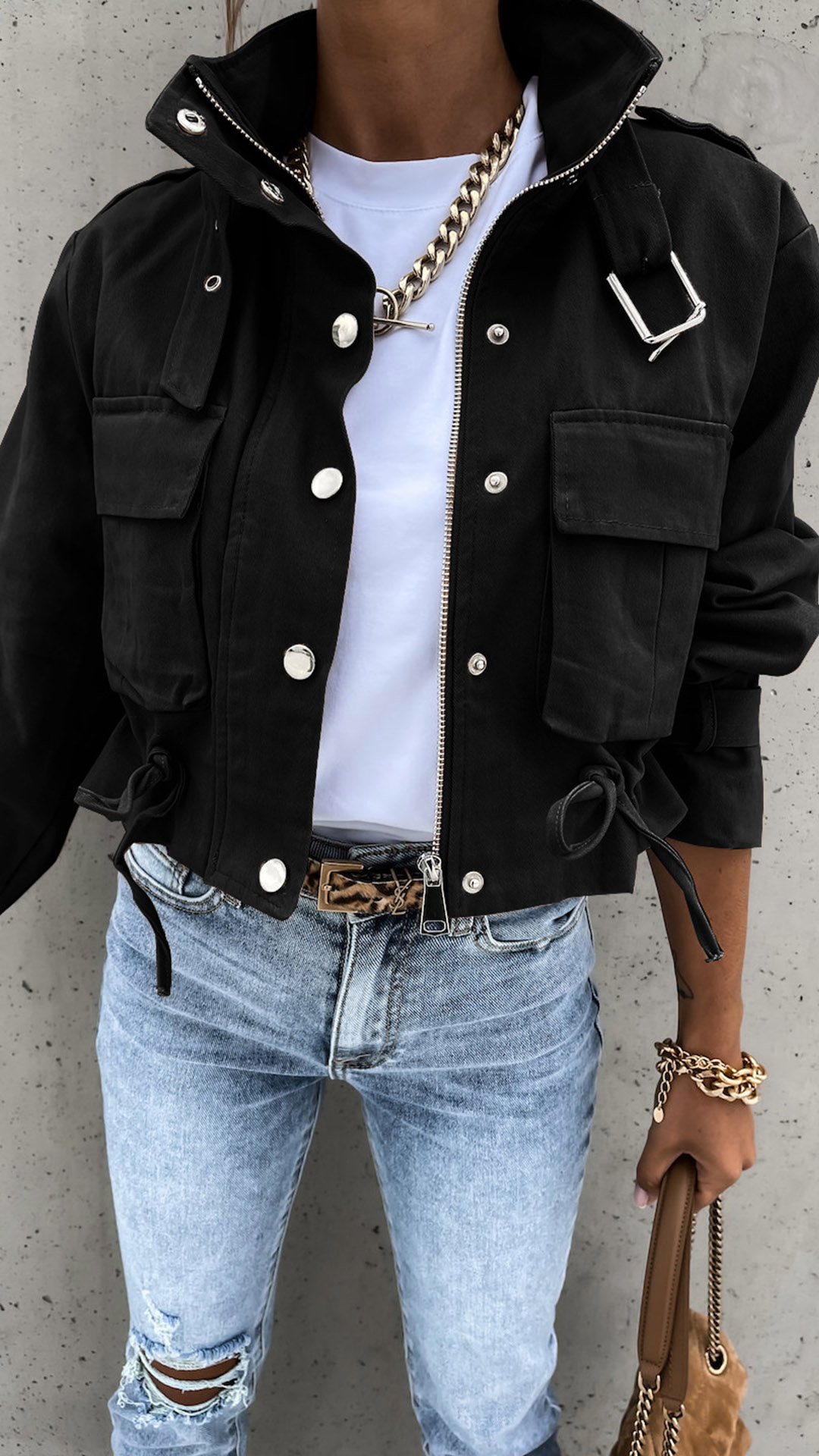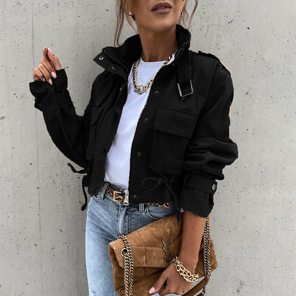 Fashion Solid Color Long Sleeve Big-pocket Stand Collar Jacket