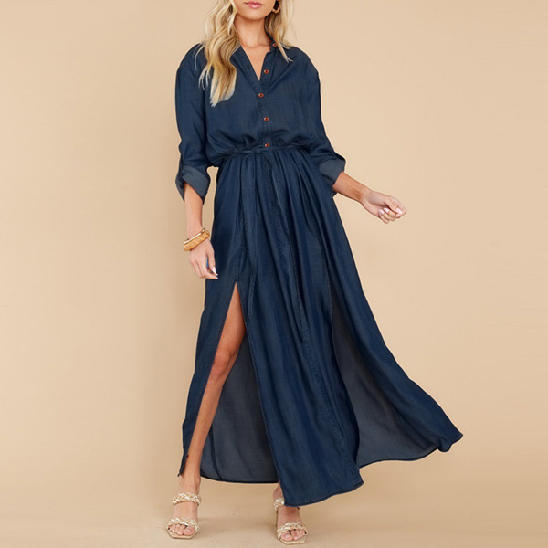 Fashion Solid Color Long Sleeve Buttoned V-neck Self-tie Ruched Slit Dress