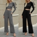 Fashion Solid Color Long Sleeve Crop Top + Pants Two-piece Set