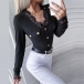 Fashion Solid Color Long Sleeve Front-button Lace Spliced Round Neck Top