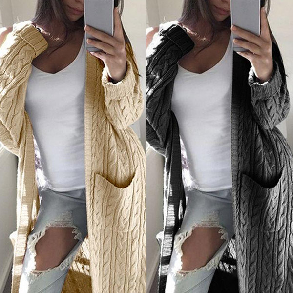 Fashion Solid Color Long Sleeve Front-pocket Loose Knit Cardigan
