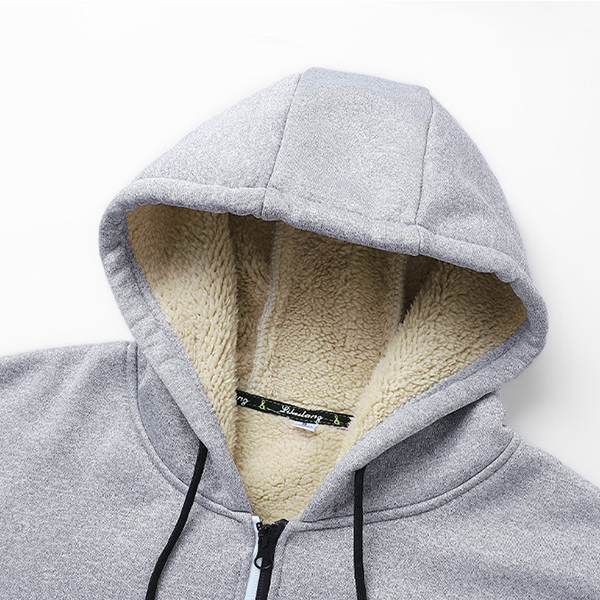 Fashion Solid Color Long Sleeve Front Zipper Drawstring Hooded Warm Plush Lined Jacket for Men