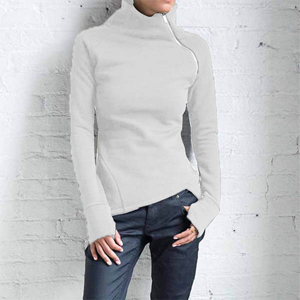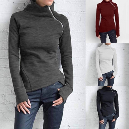 Fashion Solid Color Long Sleeve High Collar Oblique Zipper Sweatshirt