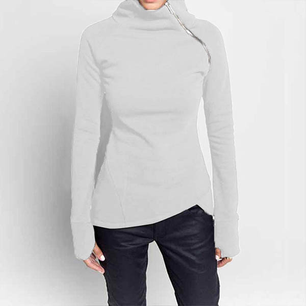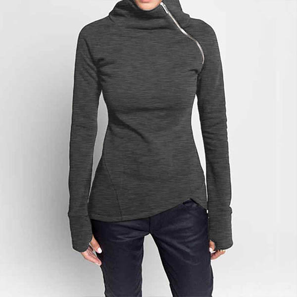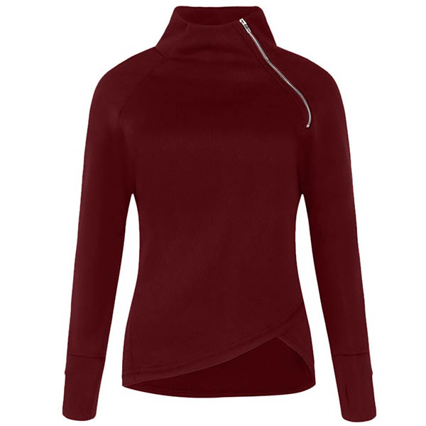 This sweatshirt boasts a solid color,finished with long sleeve and high collar design,which can offer you a comfortable day with its soft and breathable fabric. Moreover,the oblique zipper and irregular hem design will make this piece look more attractive. Like it? Then add it to your wardrobe!