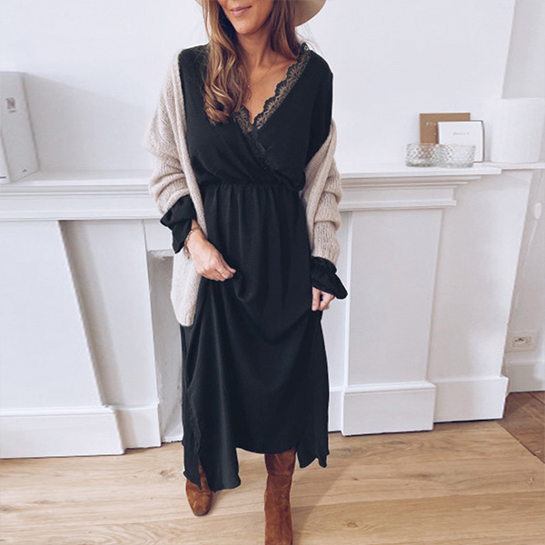Fashion Solid Color Long Sleeve High Waist Lace Spliced V-neck Dress