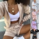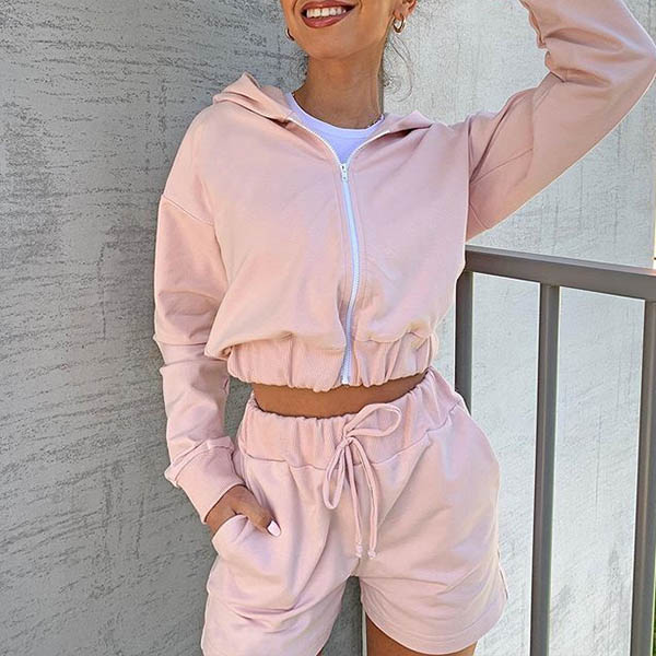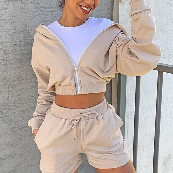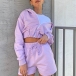 Fashion Solid Color Long Sleeve Hooded Crop Top + Shorts Two-piece Set