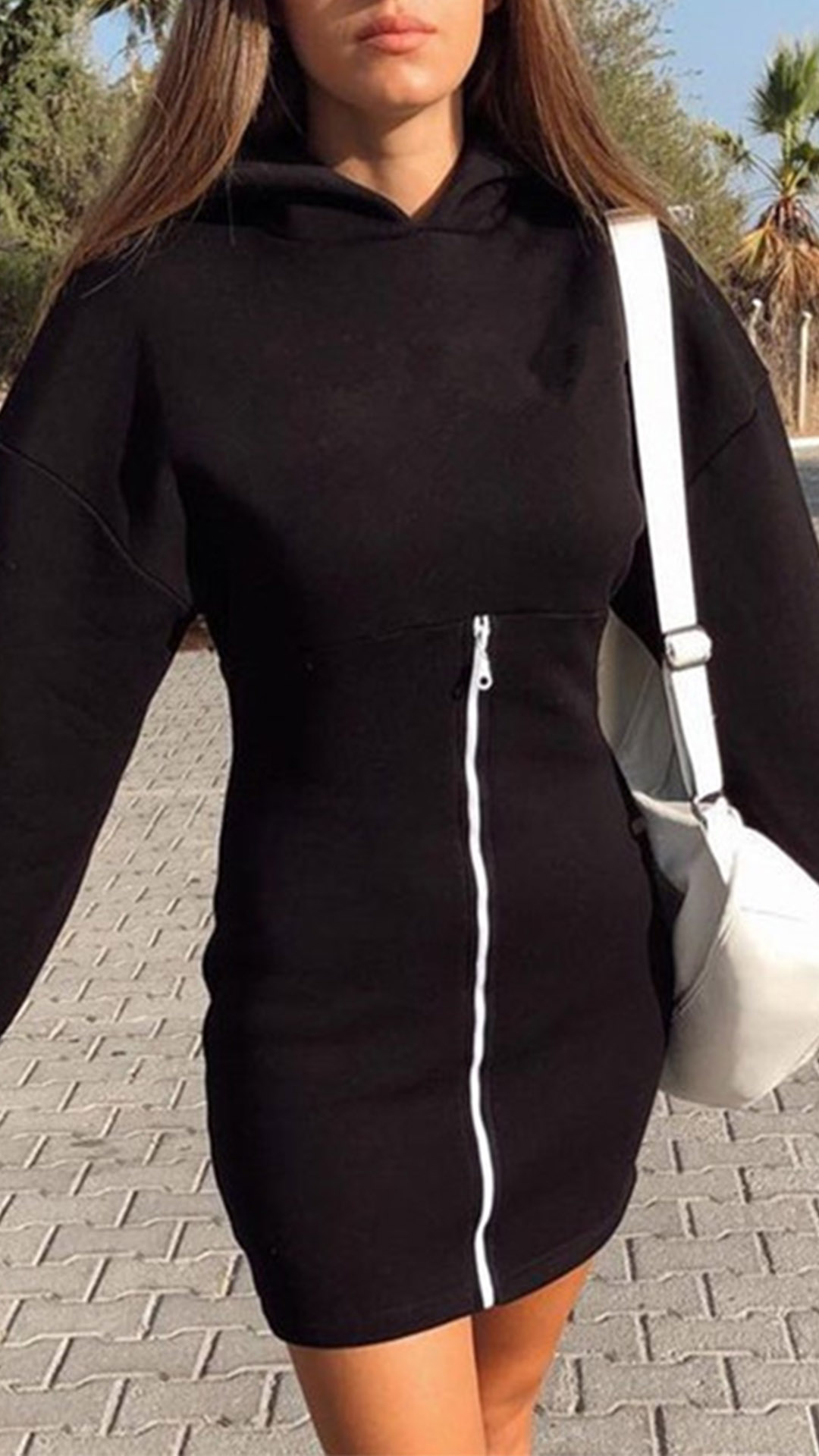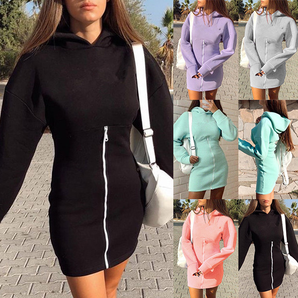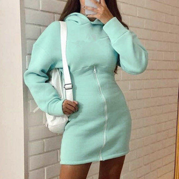 Wanna try a different style dress? The this sweatshirt dress can be your perfect choice. Crafted in a solid color,with long sleeve,hooded and a fit silhouette,this dress knows how to showcase your slender figure. What's more,the front-zipper design will add some extra charm. You can match it with your different style shoes to achieve for different fashion styles.