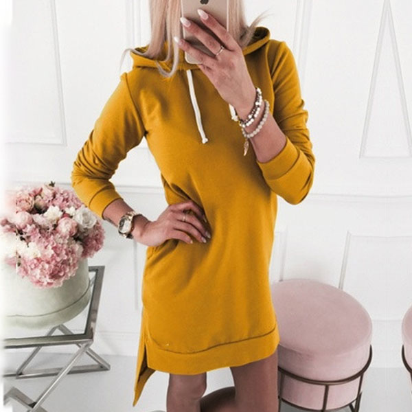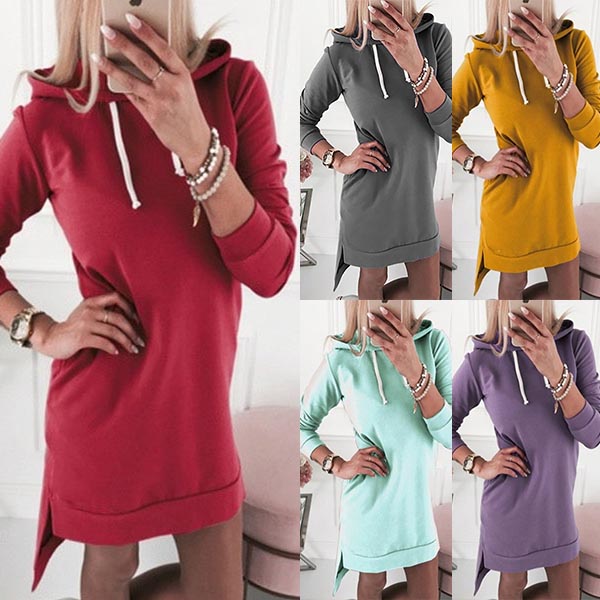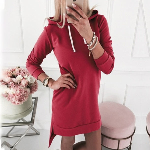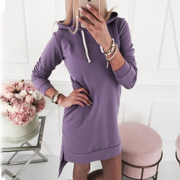 On your lazy days or casual weekends,this sweatshirt dress can be a perfect solution. Solid color style,finished with long sleeve,hooded silhouette and a high-low hem,this dress can give you a comfortable day while it maintains a casual but fashionable style.