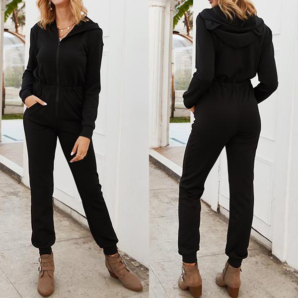 Wanna have a try different way to showcase your chic and stylish personality? Then look no further than this jumpsuit! Comes with a classic yet flattering black tone,with long sleeve,hooded silhouette and high waist design,this wonderful piece not only can give you a comfortable day,but also can showcase your slender figure.