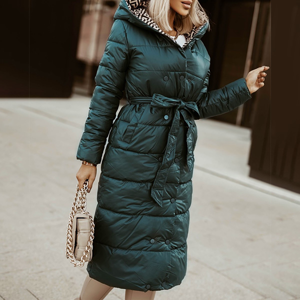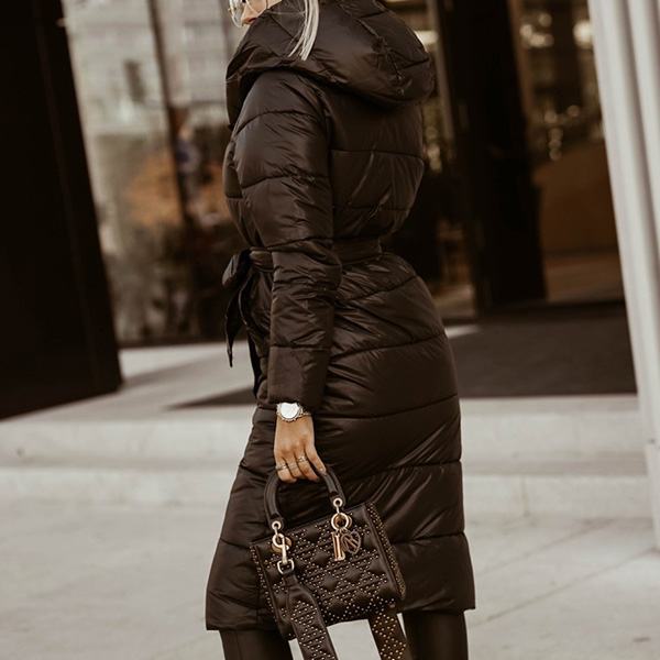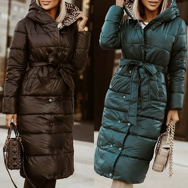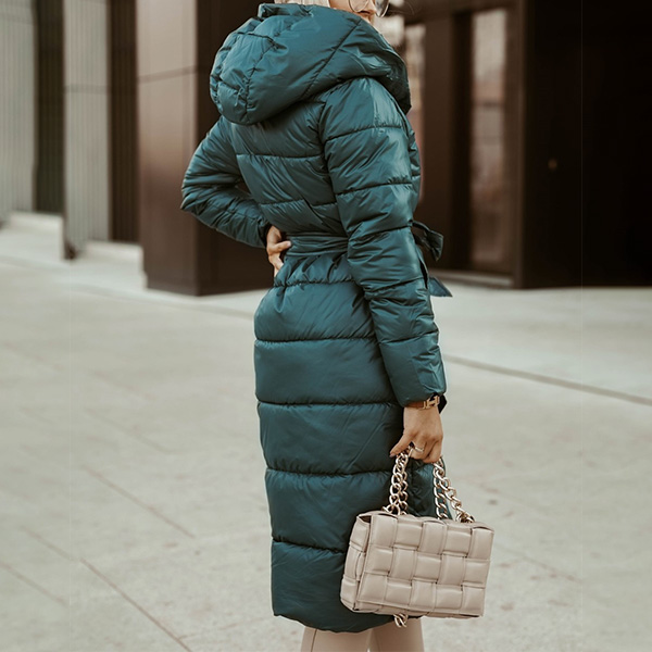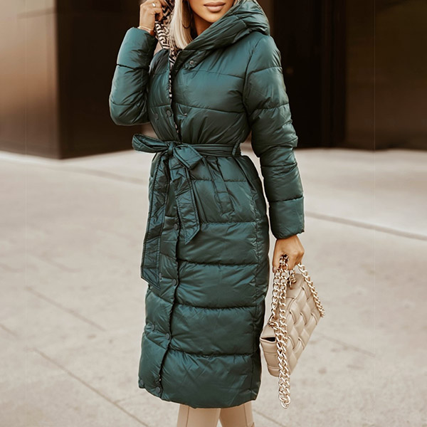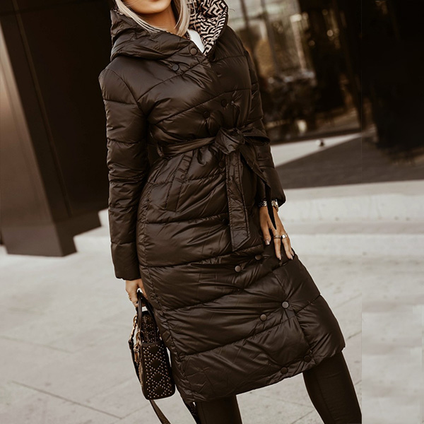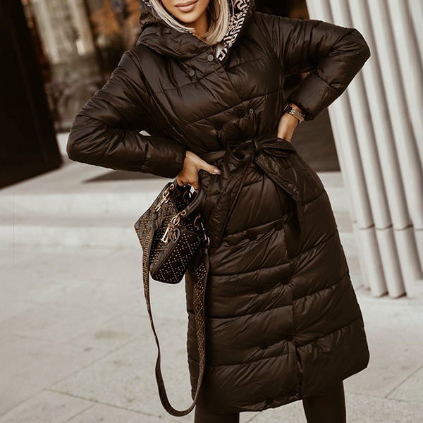 Fashion Solid Color Long Sleeve Hooded Long-style Warm Padded Coat with Waist Strap