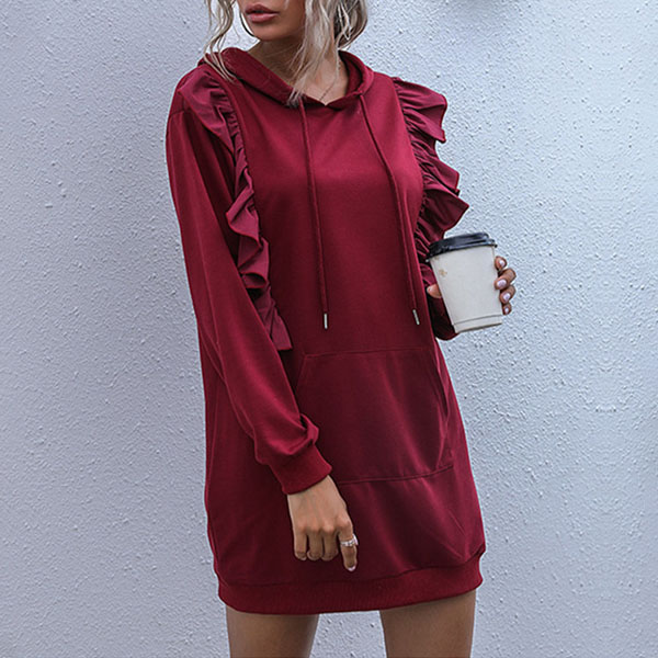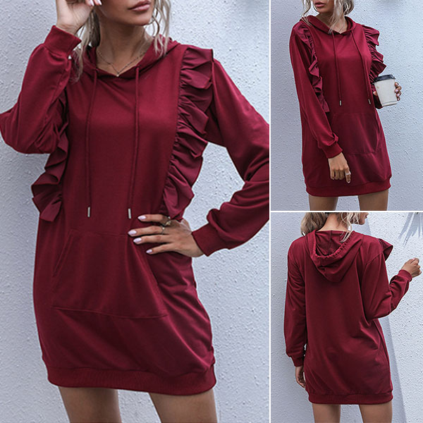 Thanks to the soft and breathable fabric,you can have a comfortable day in this dress. Boasts a solid color,finished with long sleeve,hooded silhouette and ruffle design,this dress is just he thing you need on your casual days and weekends.