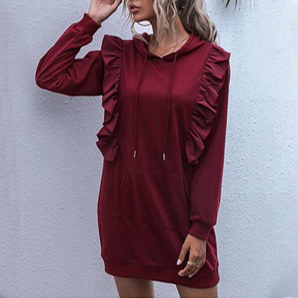 Fashion Solid Color Long Sleeve Hooded Ruffle Dress