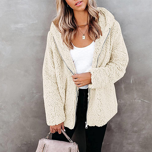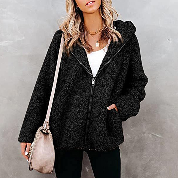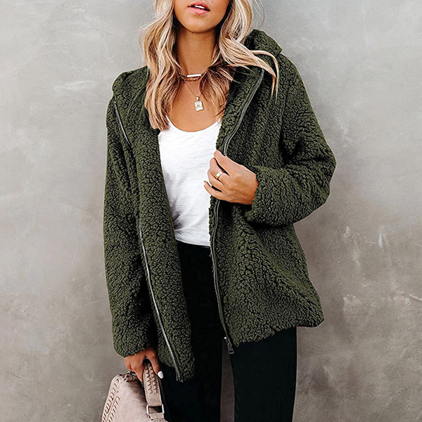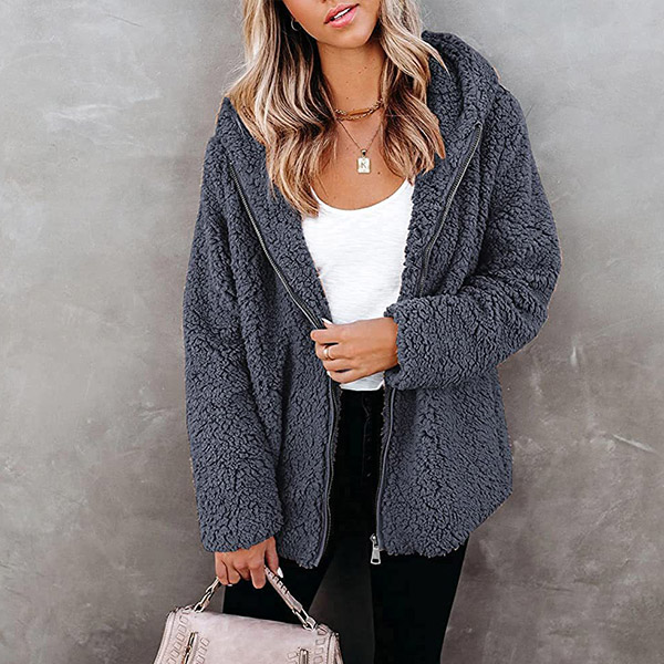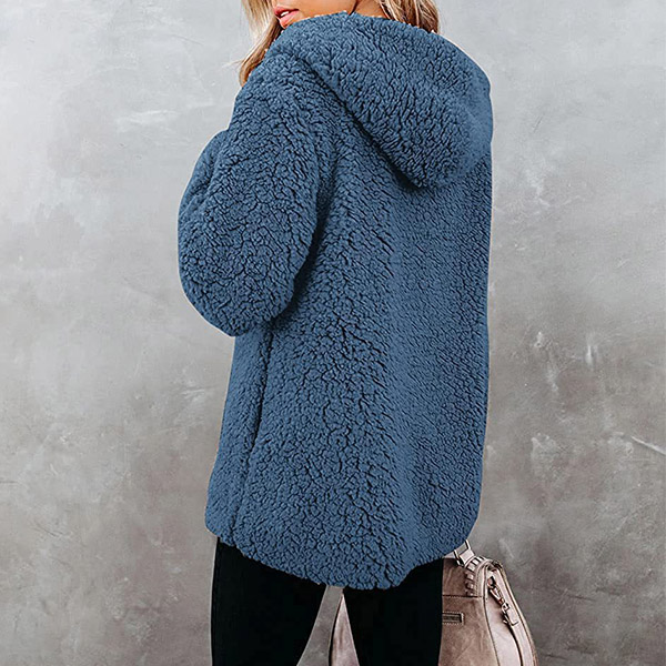 Fashion Solid Color Long Sleeve Hooded Zipper Clousre Plush Coat