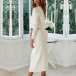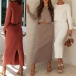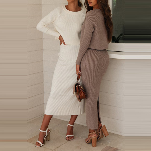 In these autumn days,this cozy yet stylish knit two-piece set can easily arouse your attention. Solid color style,including a long sleeve round neck top and a high waist slit hem skirt,this two-piece set exude your style and charm. So why not enrich your wardrobe ensemble with this two-piece set?