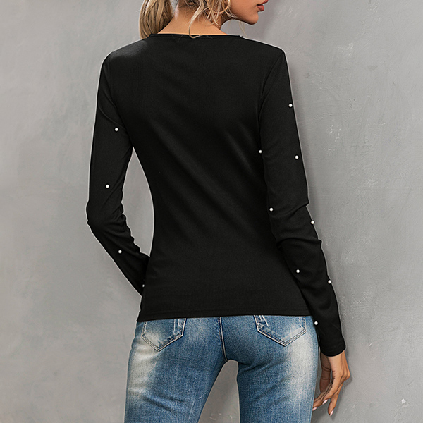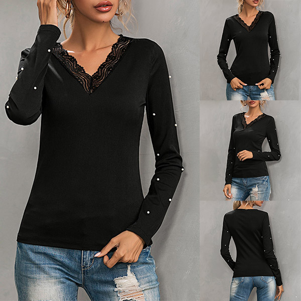 Your wardrobe calls for such a simple,cozy yet stylish t-shirt. The flattering black tone and fit silhouette design can showcase your perfect body-line,while the lace spliced v-neck and pearls details will make this piece look more stylish and attractive. Just invite this piece to your wardrobe and it won't let you disappointed!