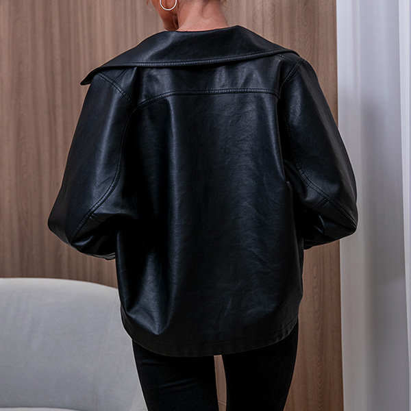 Not only can keep you warm,but also can offer you a cool yet fashionable daily look,that's why we suggest you this PU leather coat. Comes with a classic and flattering black tone,finished with long sleeve,lapel and a loose silhouette,this PU leather coat knows how to exude your style and personality.