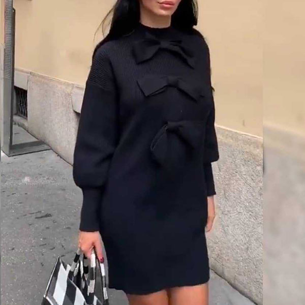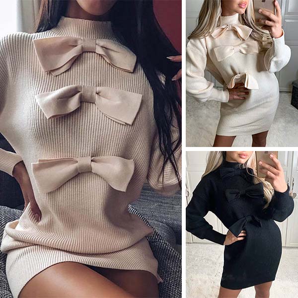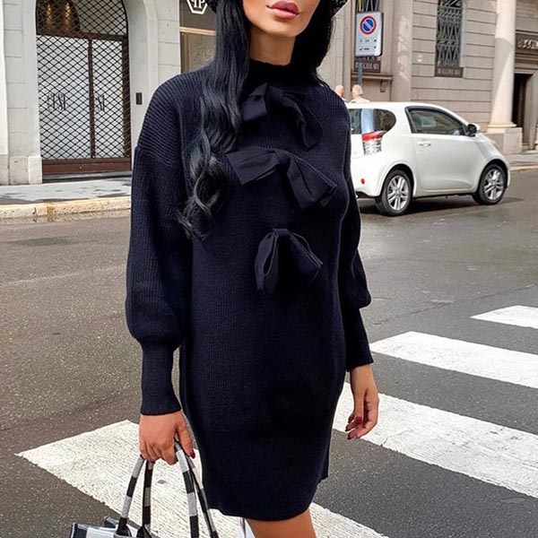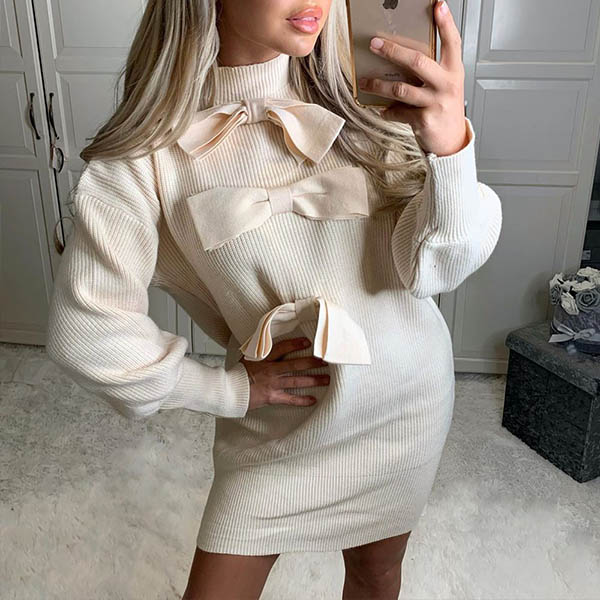 Fashion Solid Color Long Sleeve Mock Neck Bow-knot Knit Dress