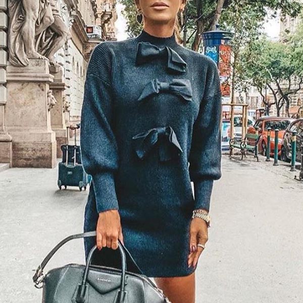 It is an easy thing to look good and sassy with this knit dress. Solid color style,finished with long sleeve,mock neck and a clean silhouette,this knit dress knows how to keep you warm as well as stylish. Moreover,the bow-knot design will further enhance its charm. For these spring and autumn days,this piece is a good choice.