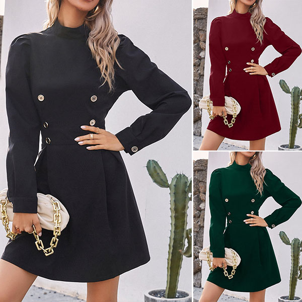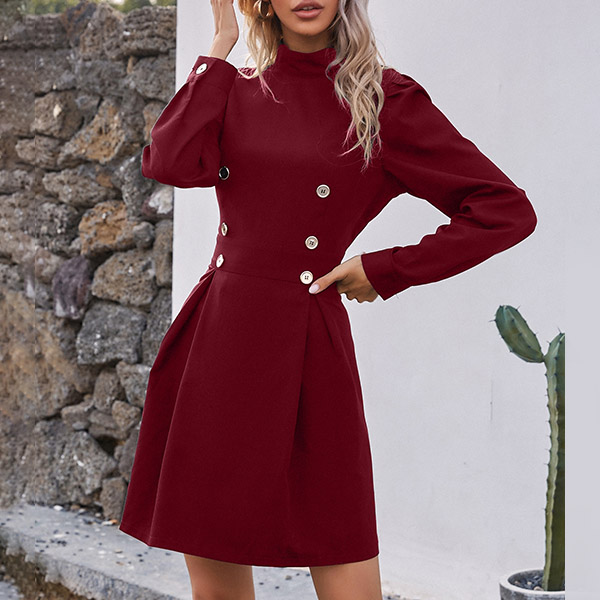 If style and comfort is what you're seeking for, then this dress is sure to strike your fancy. Crafted in a solid color,with long sleeve,mock neck and high waist design,this delicate dress can portray your elegant and charming image. Moreover,the double-breasted design will make this piece look more attractive.