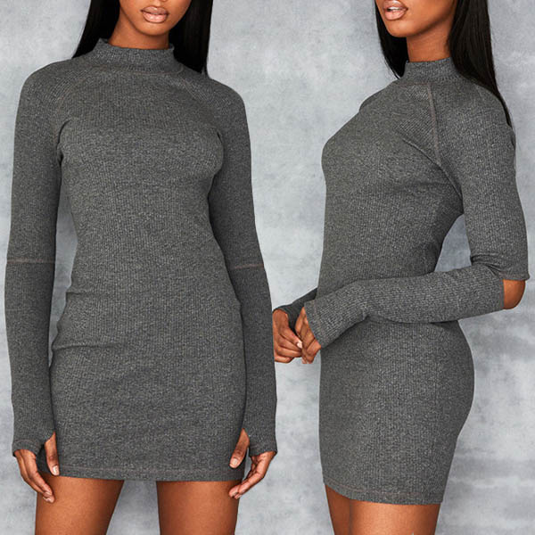 Fashion Solid Color Long Sleeve Mock Neck Slim Fit Dress