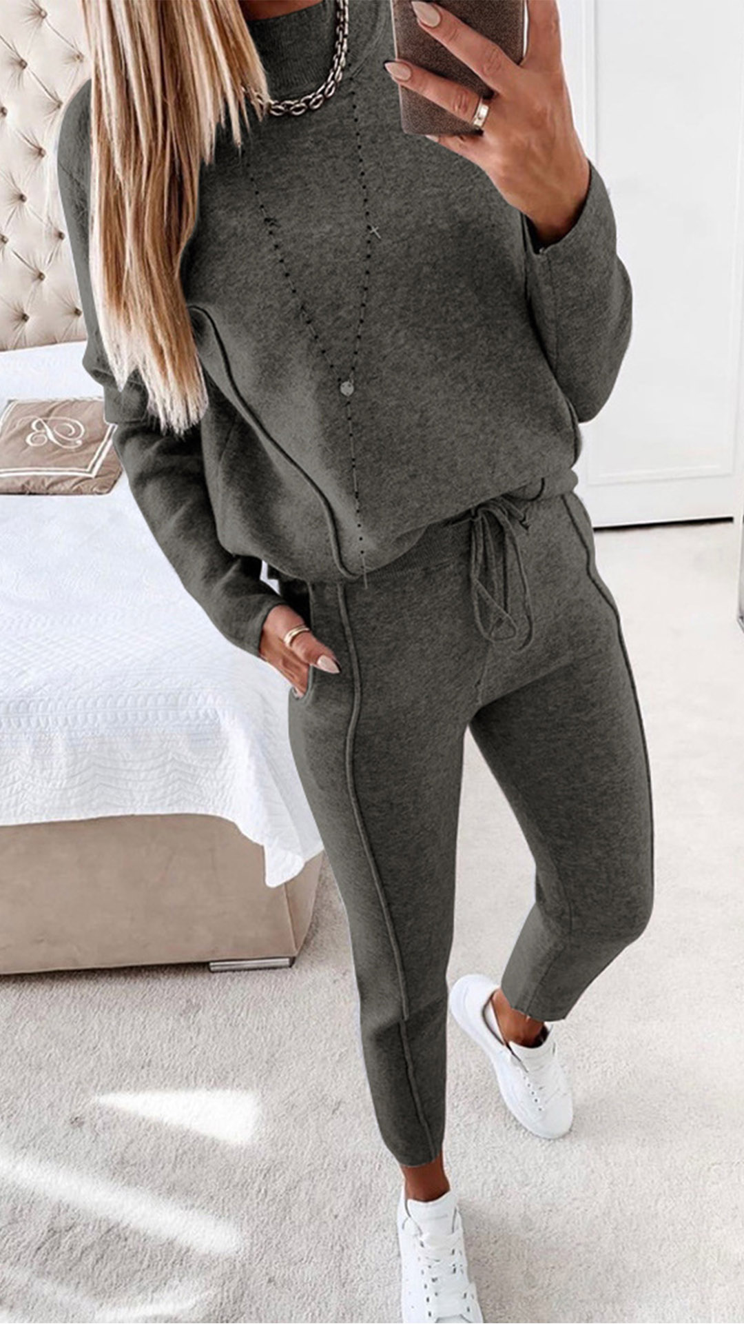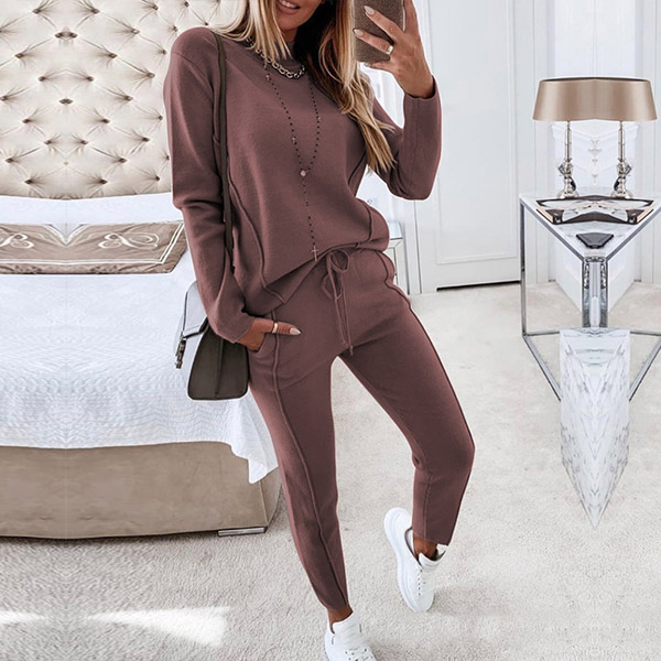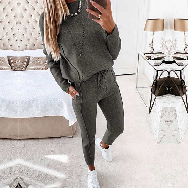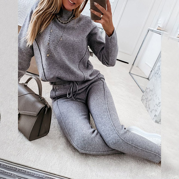When it comes to a laid-back yet fashionable autumn look,you can just make your eyes focused on this two-piece set. Solid color style,including a long sleeve mock neck sweatshirt and a pants,crafted from soft and breathable fabric,this two-piece set can give you a warm and comfortable day.