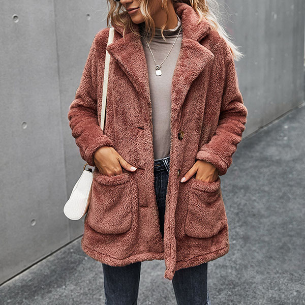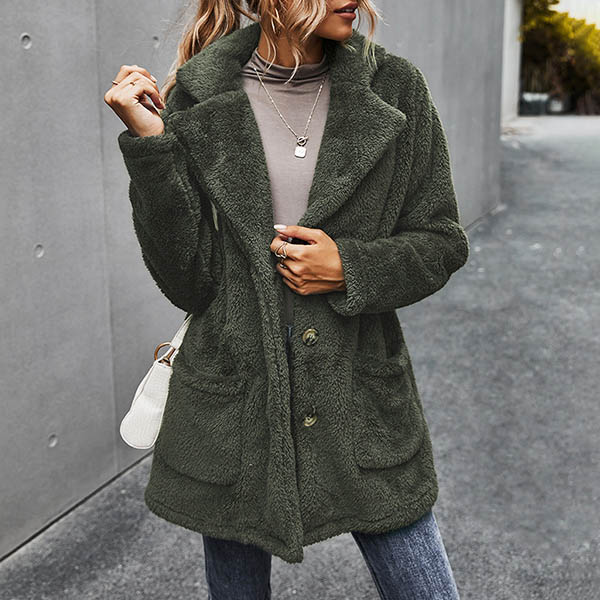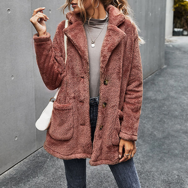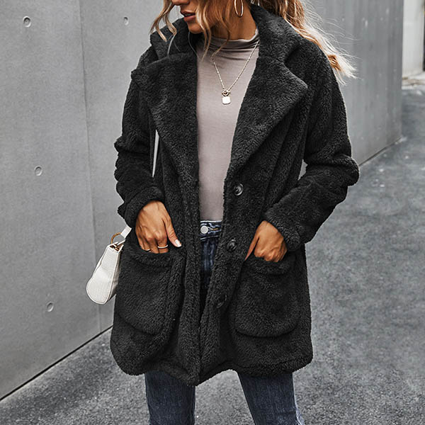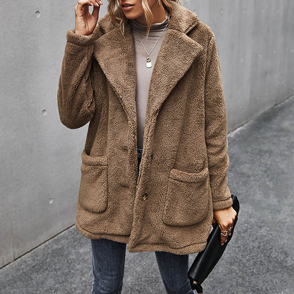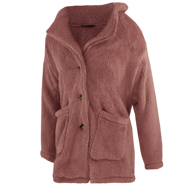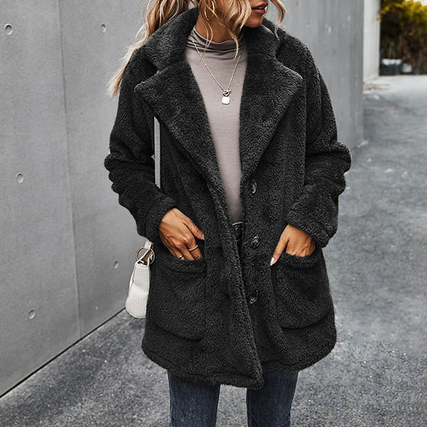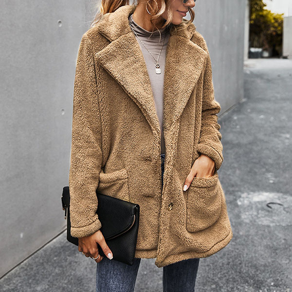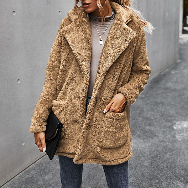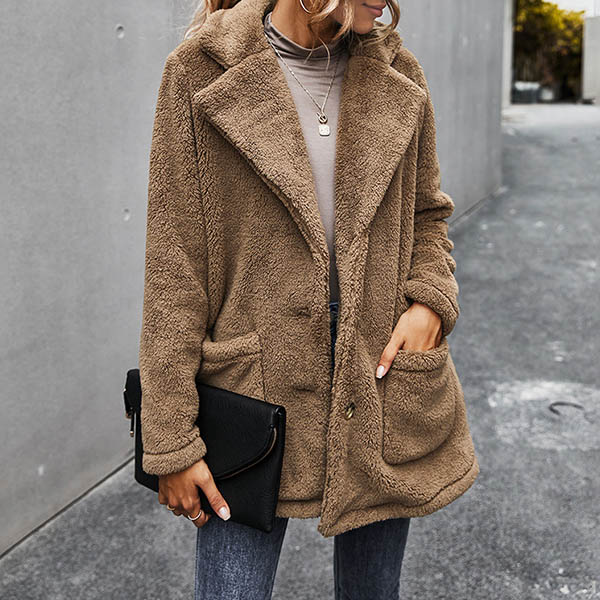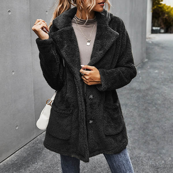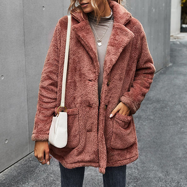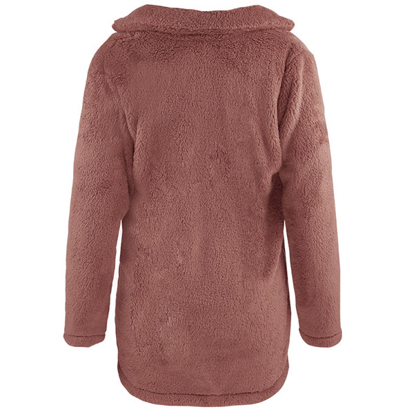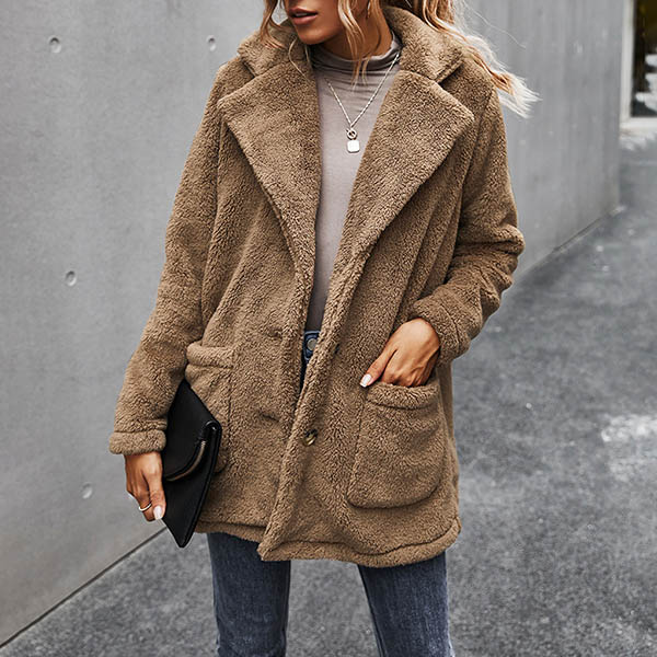 Fashion Solid Color Long Sleeve Notched Lapel Plush Coat