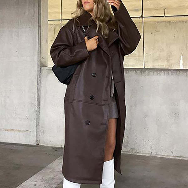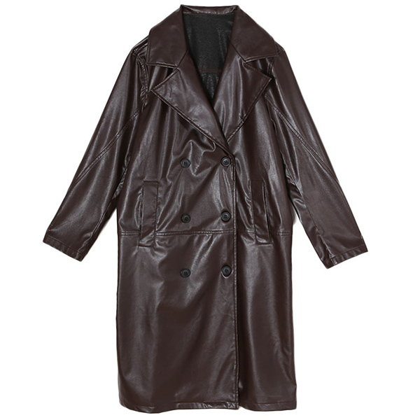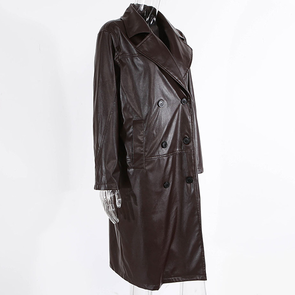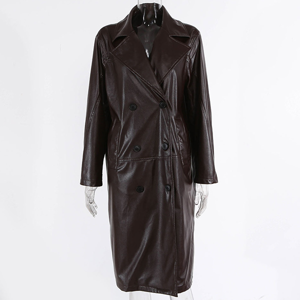 Fashion Solid Color Long Sleeve Notched Lapel PU Leather Windbreaker Coat